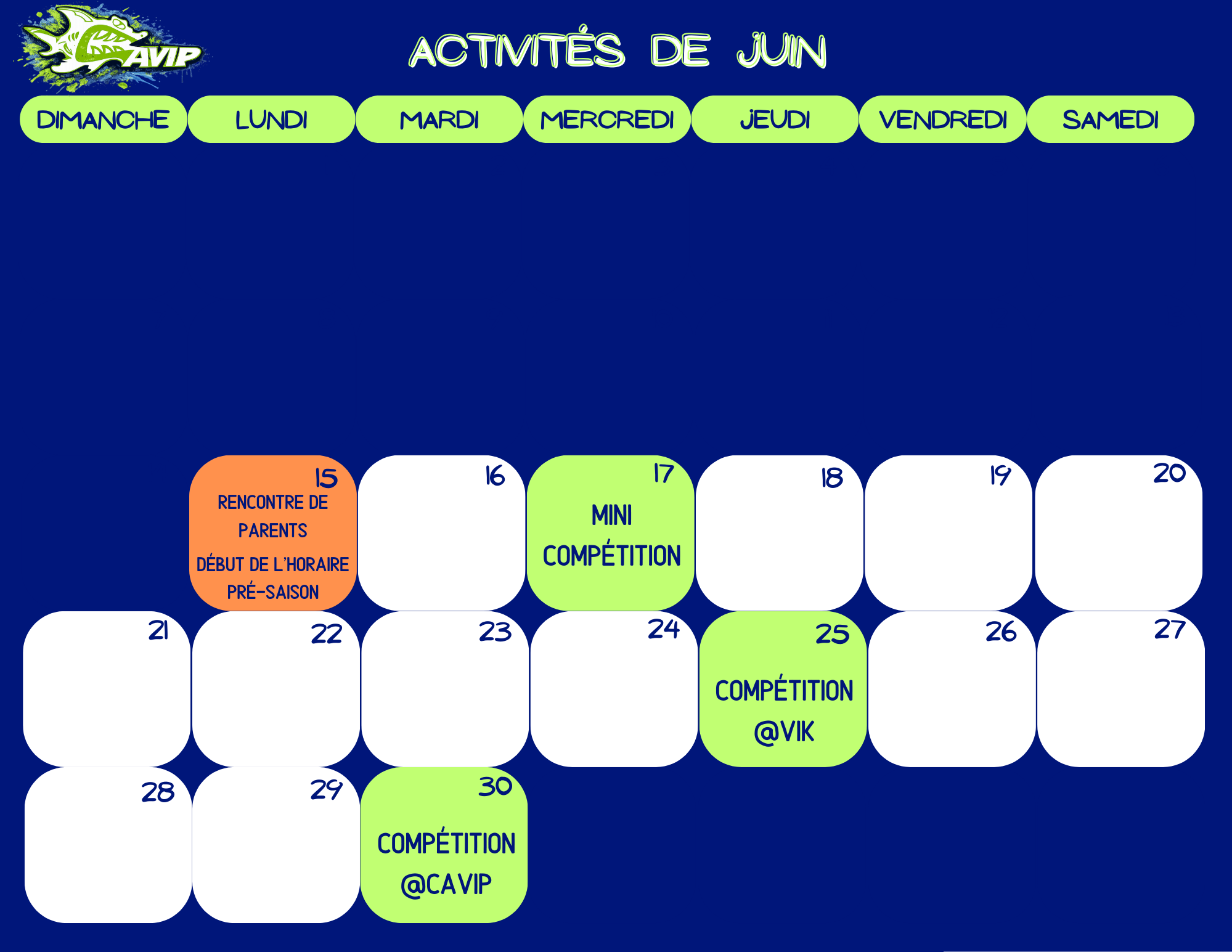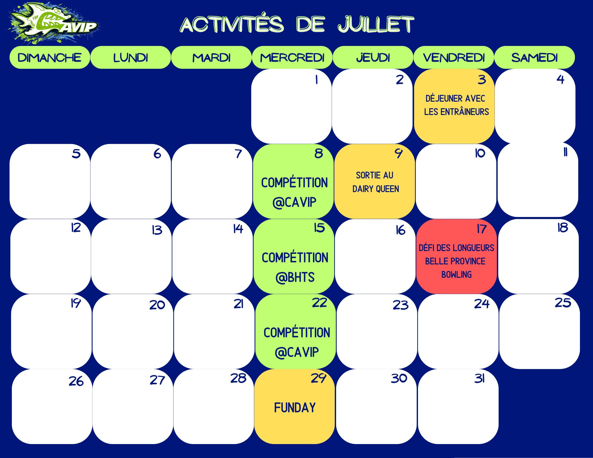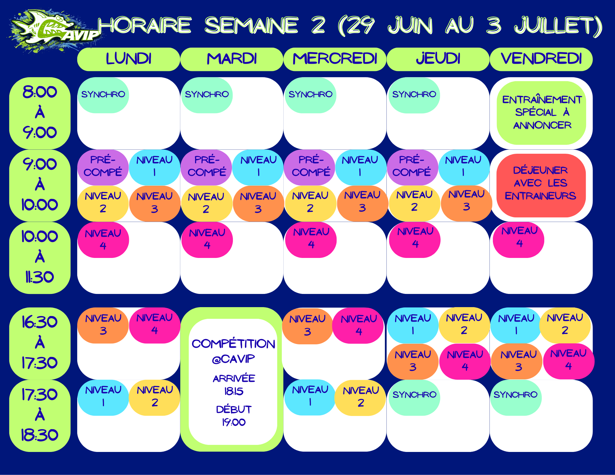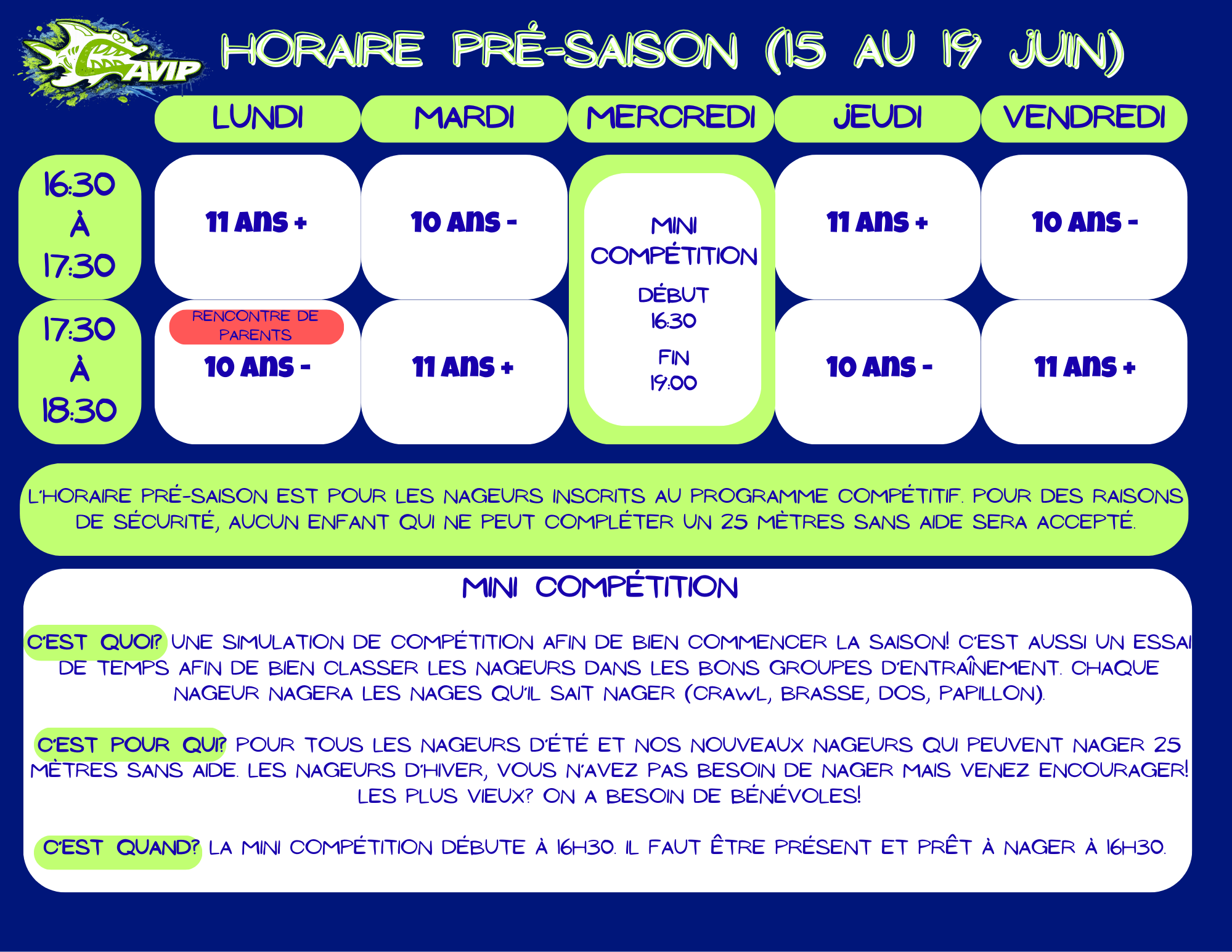 *Aucun maillot ou casque de bain d’une autre équipe ne sera toléré. Venez nous voir si vous n’avez pas de casque CAVIP.