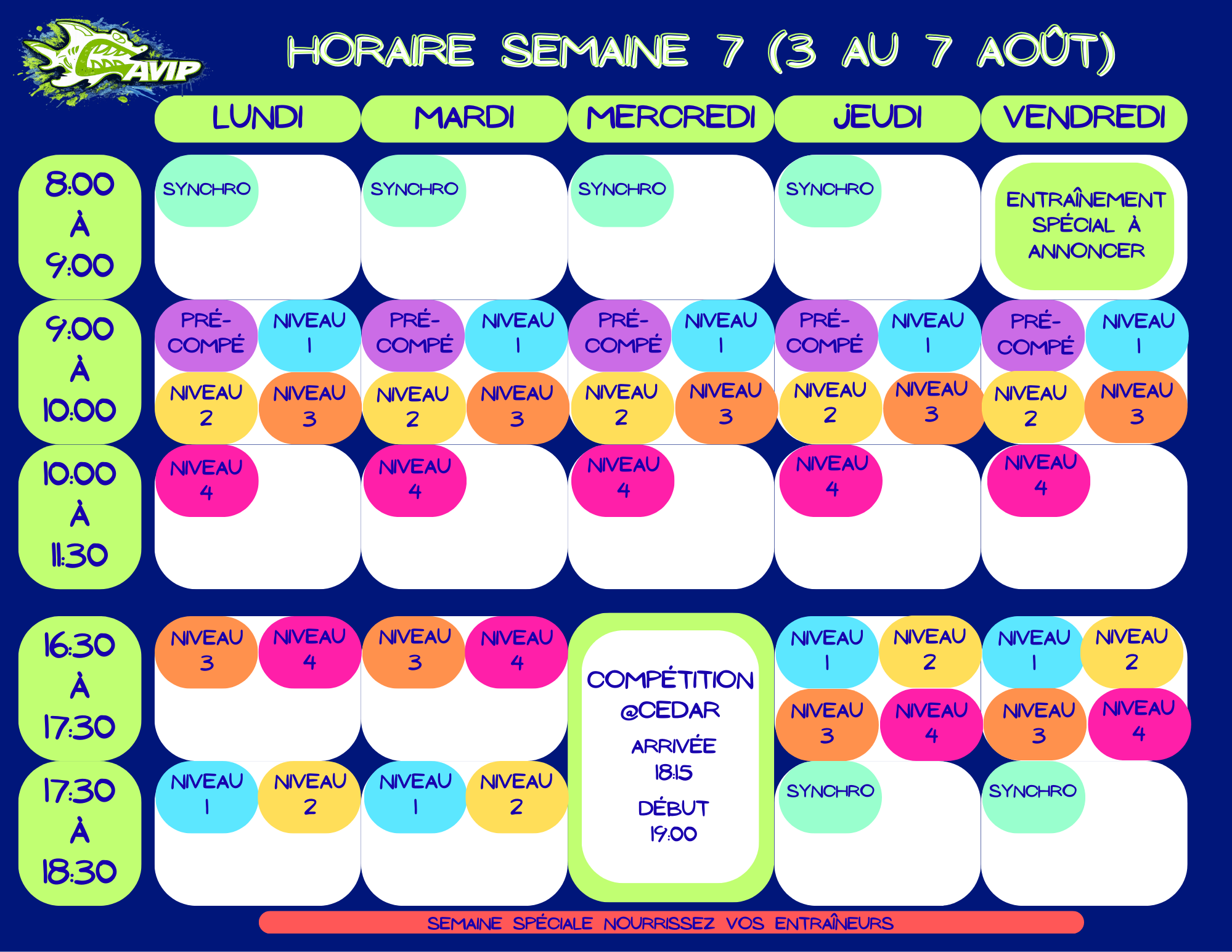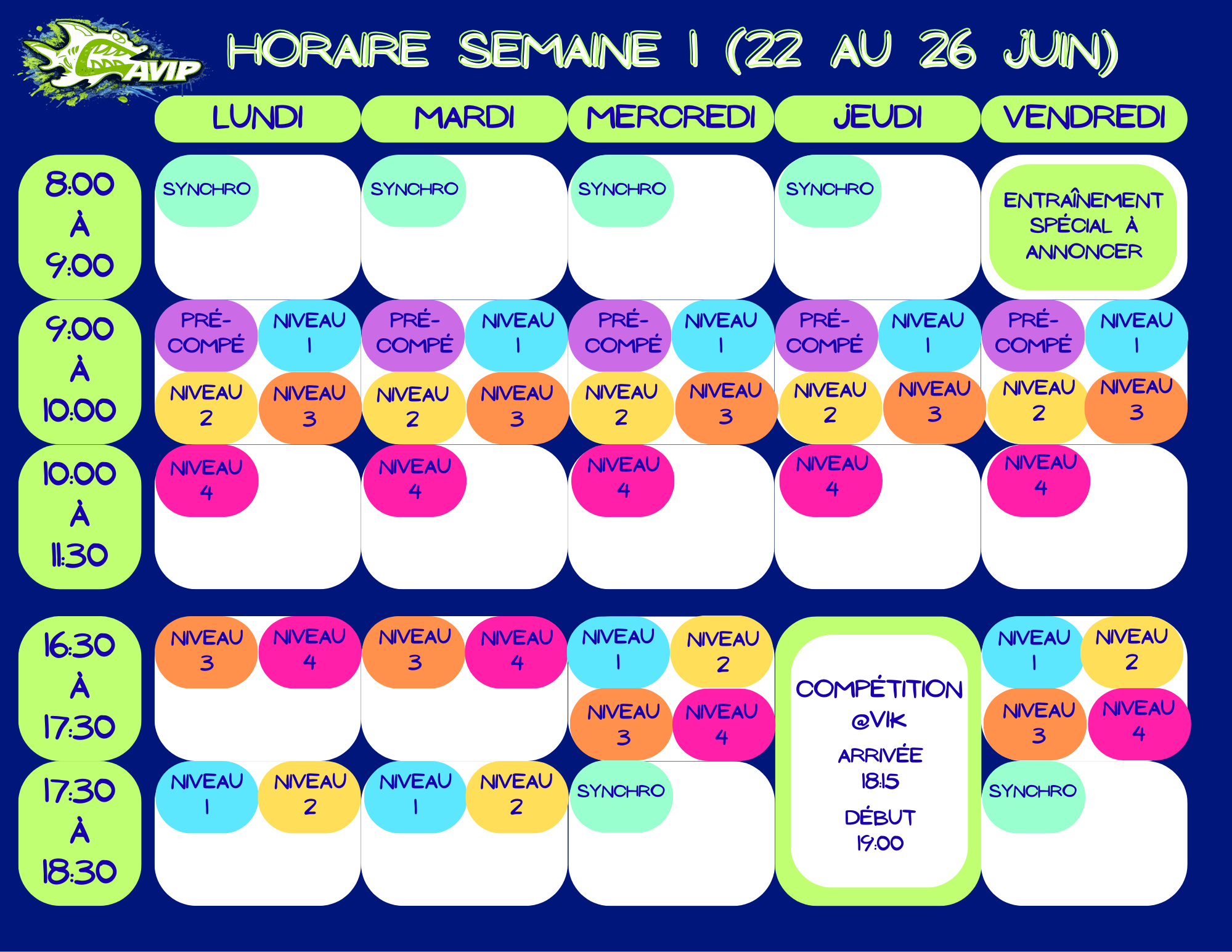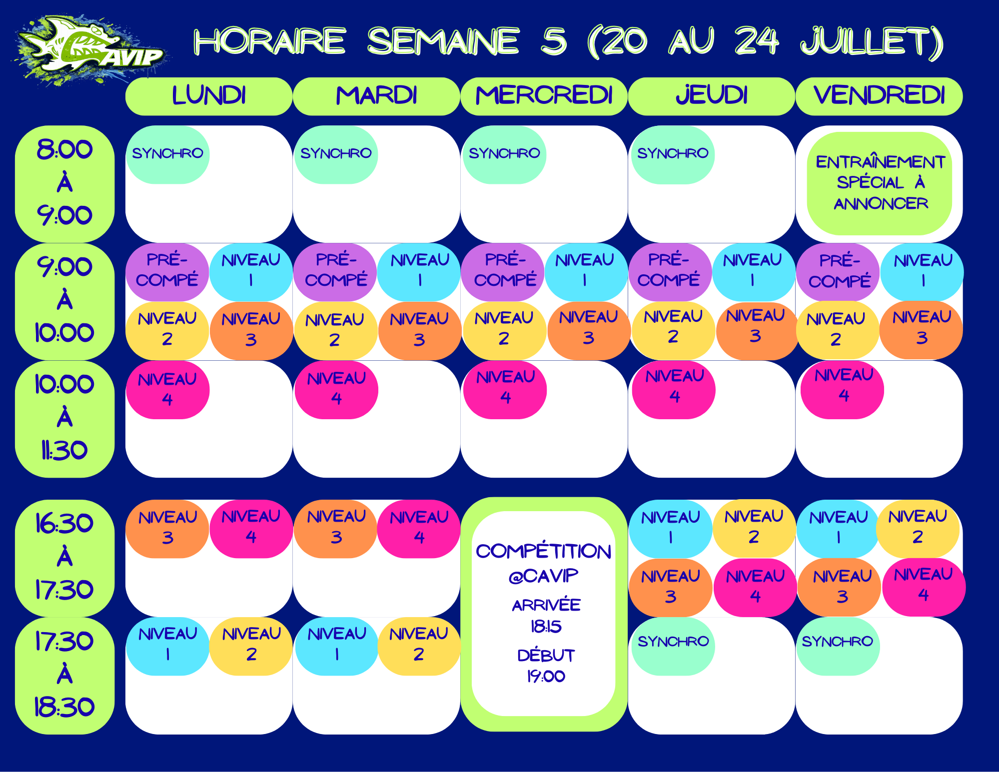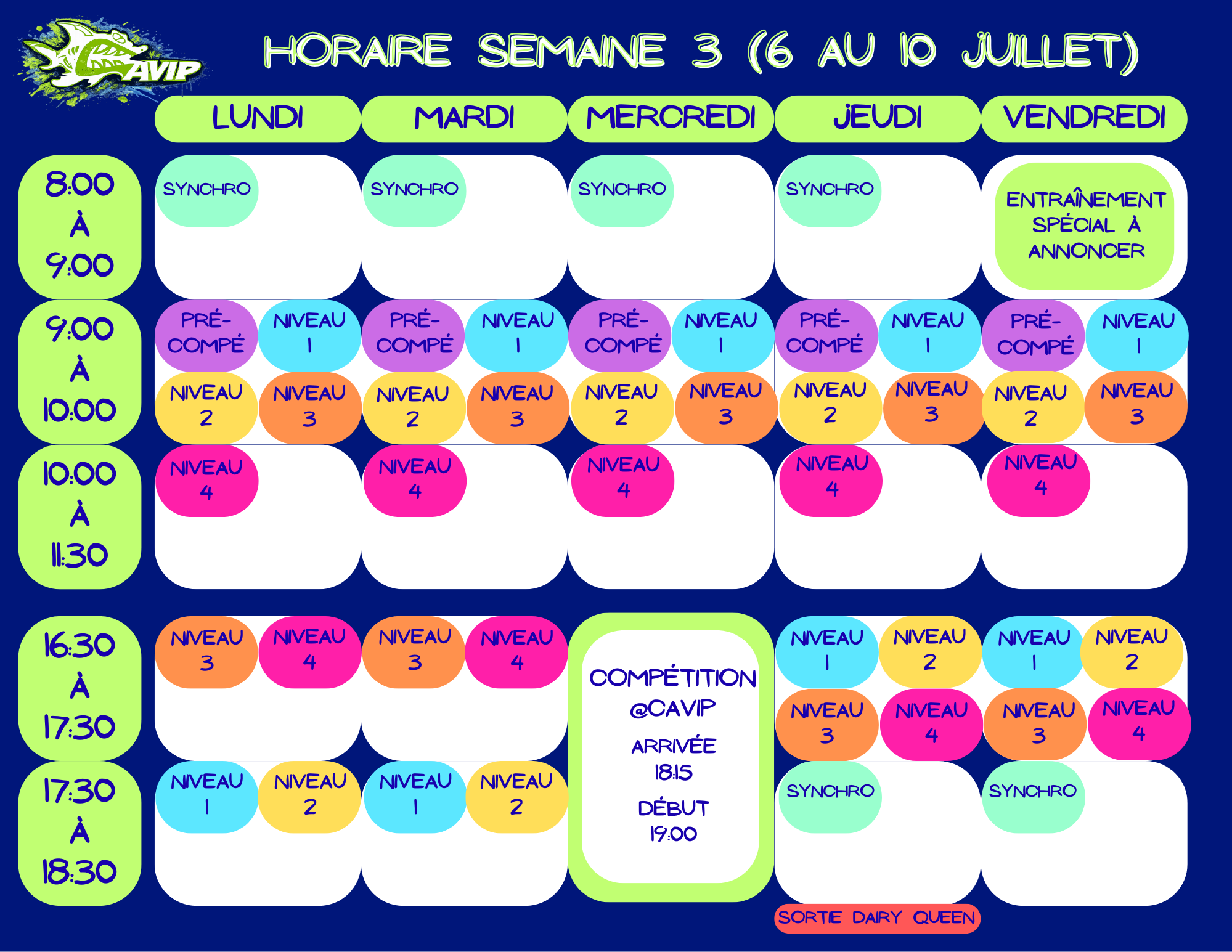 *Aucun maillot ou casque de bain d’une autre équipe ne sera toléré. Venez nous voir si vous n’avez pas de casque CAVIP.