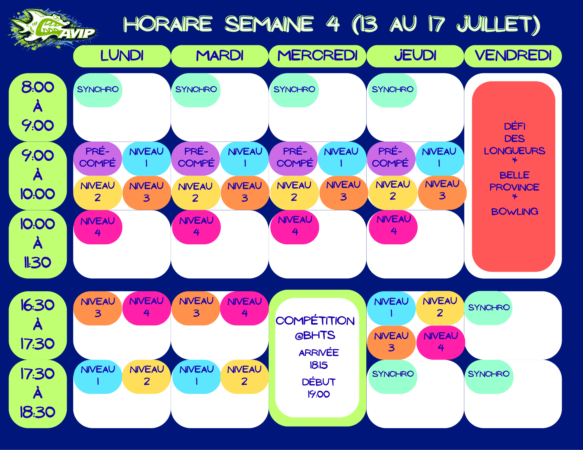 Chaque semaine, du 25 juin au 5 août, nous avons rendez-vous à 18 h 15 dans une piscine de la région pour affronter une équipe locale. Ambiance festive garantie !