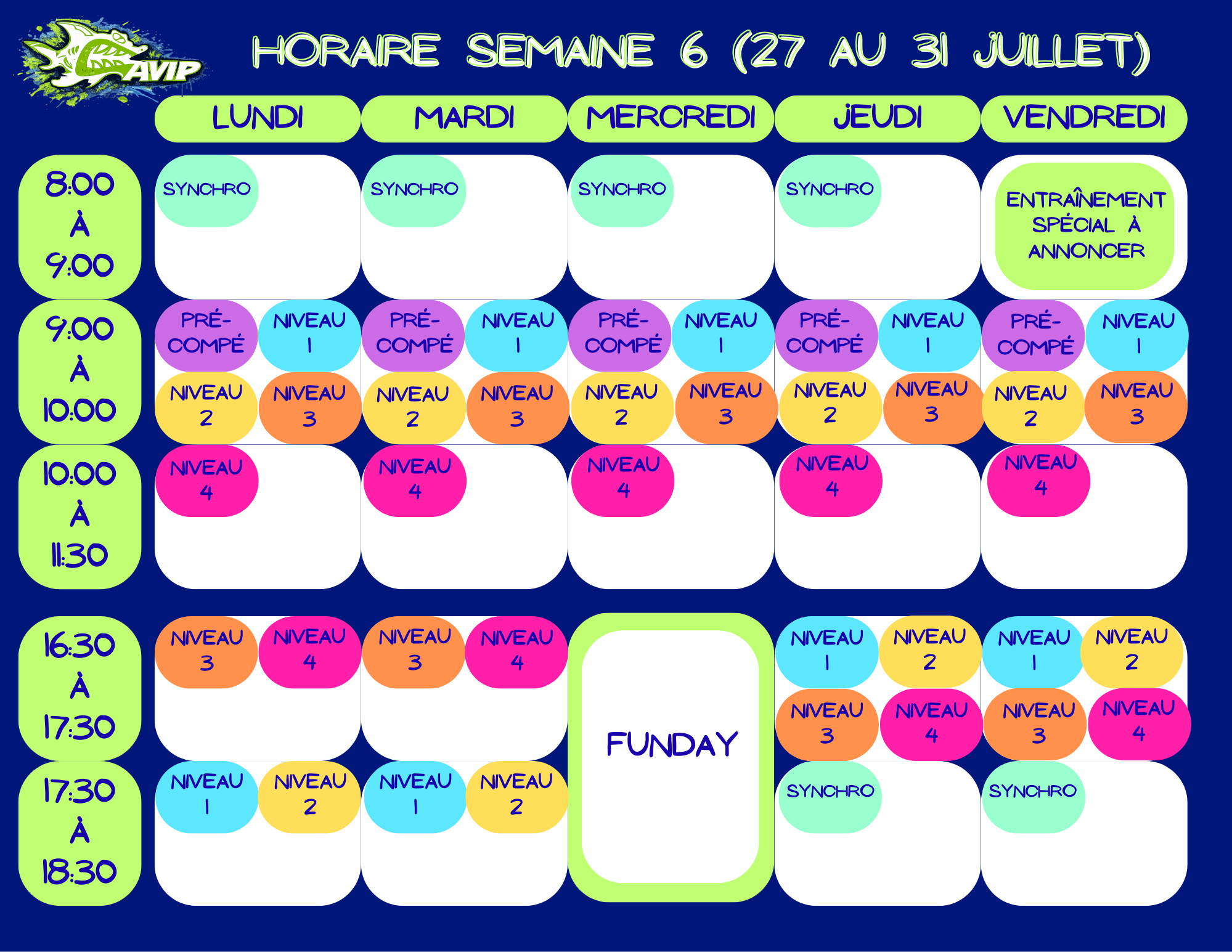 | SEMAINE 6 | 29 JUILLET (MERCREDI) | FUNDAY À NOTRE PISCINE ! | |