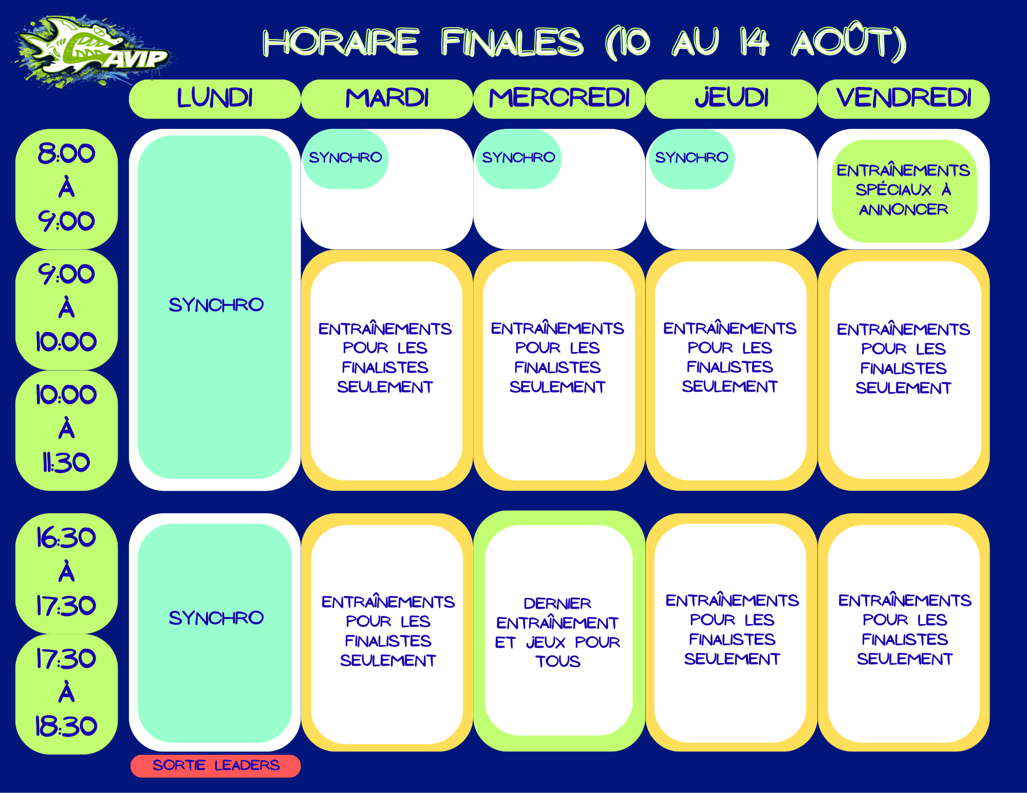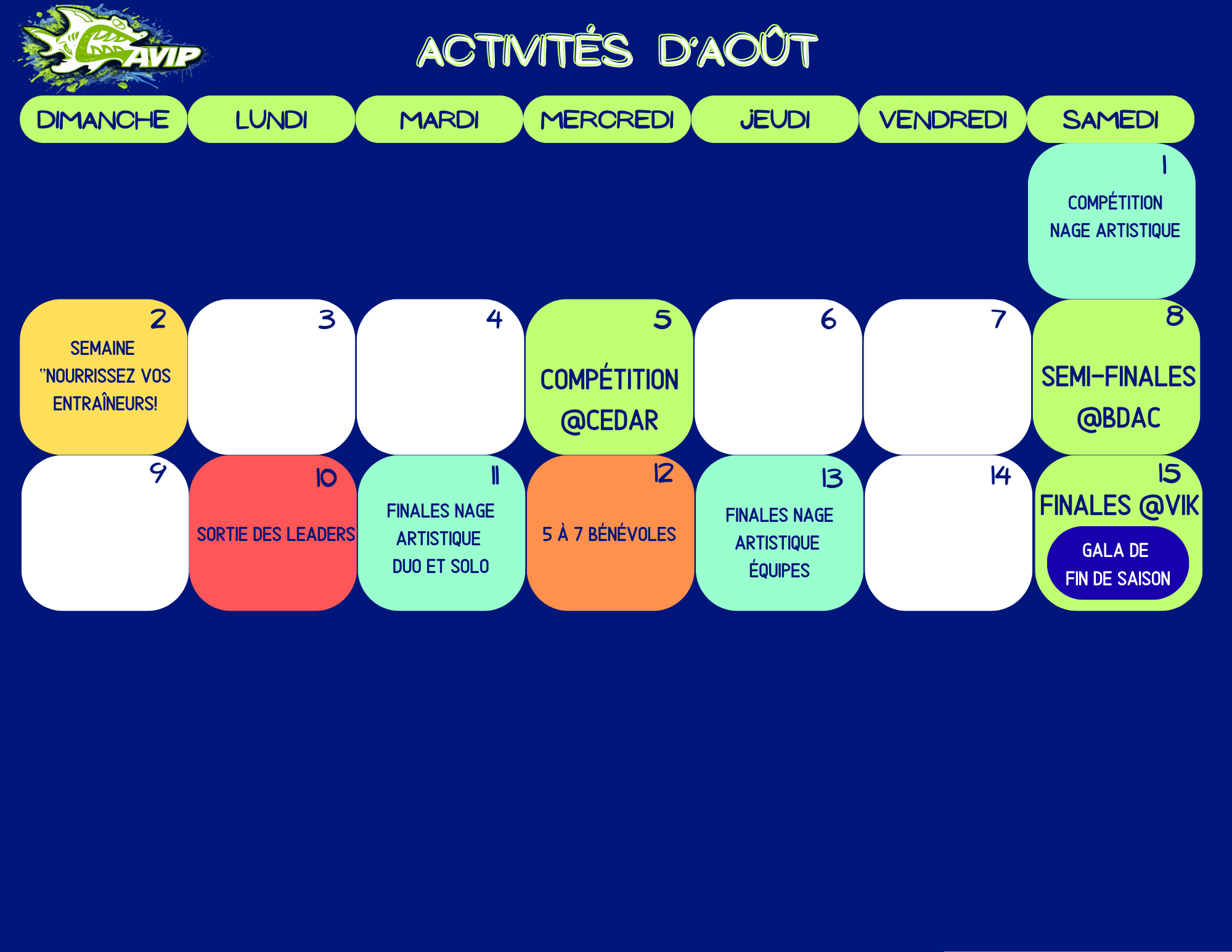 | FINALES | 15 AOÛT (SAMEDI) Journée complète | @ VIK (SUR INVITATION) 113 Viking Av., Pointe-Claire | |